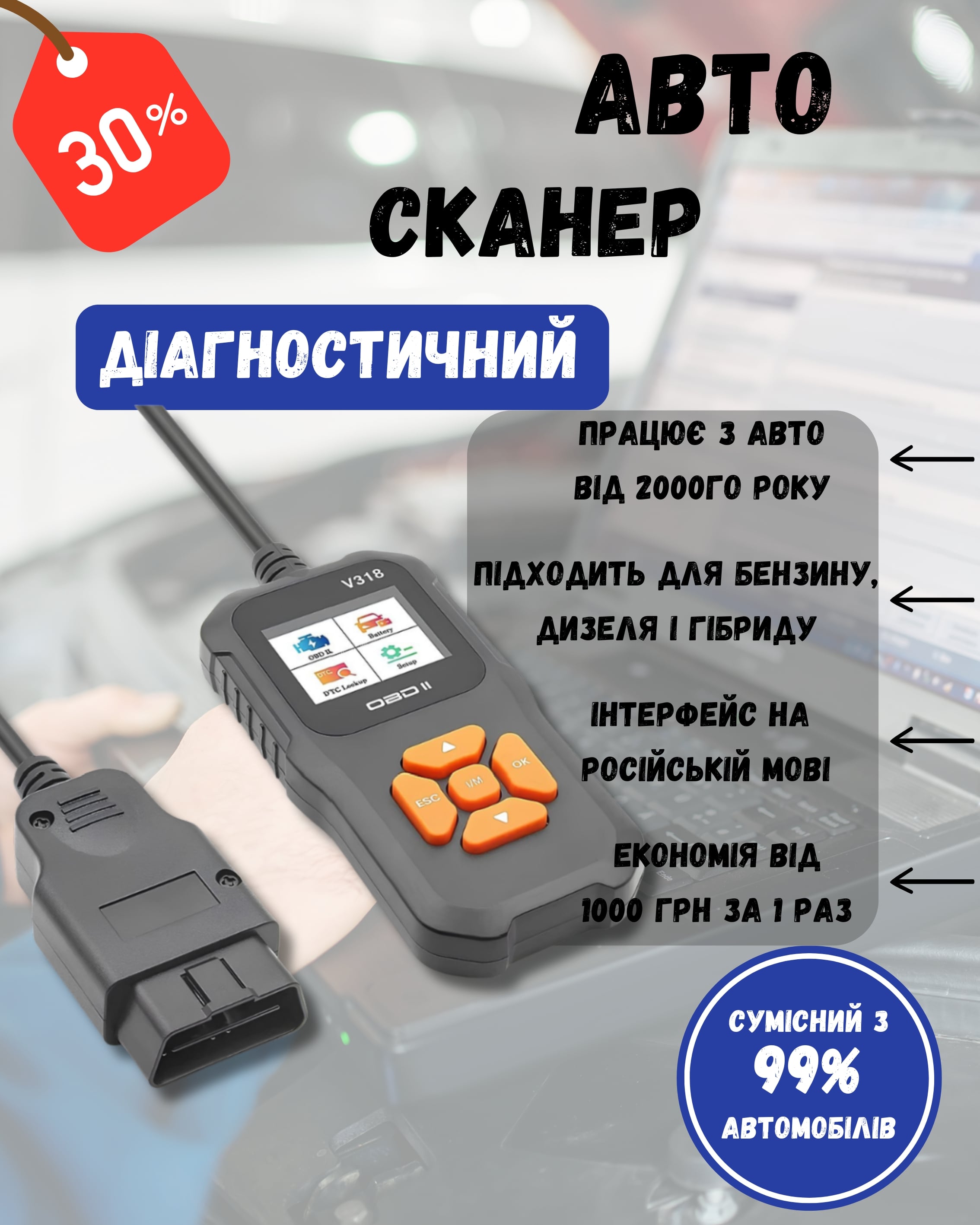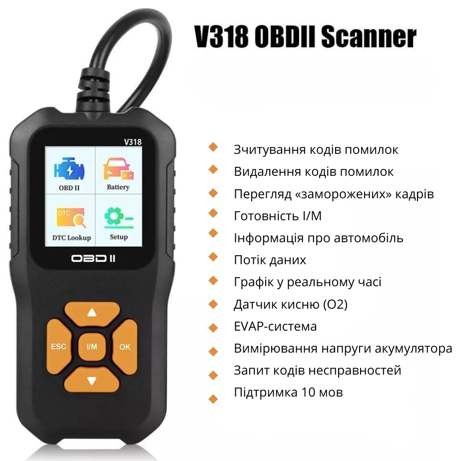 розпродажАвтосканер V318 — універсальний пристрій для самостійної діагностики. Просто підключіть у роз'єм OBD2 — і вже за 2 хвилини побачите, що не так із вашим авто. Підходить для машин після 2000 року: бензин, дизель, гібрид, авто з Європи, Америки, Азії та Кореї.